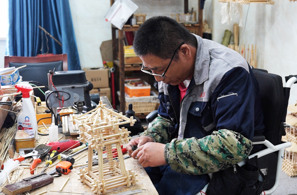 中秋节临近,培训师李永刚正在指导学员制作节日工艺品。从各类仿古建筑模型到精致的灯笼、手机支架,一根根竹条在李永刚的手里经过选、剪、削、拼装等流程变成一件件扎刻工艺品。