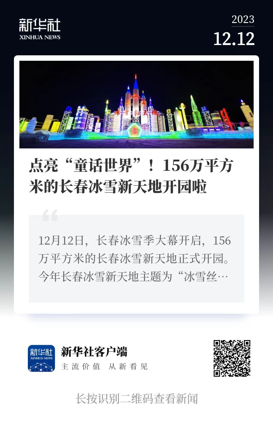 12月12日,长春冰雪季大幕开启。156万平方米的长春冰雪新天地正式开园。今年长春冰雪新天地主题为“冰雪丝路 龙腾盛世”。景区规划冰雪丝路区、龙腾盛世区、天定乐园区、冰雪影都区、激情乐冰区五大主题区域。67万平方米的冰雪游乐空间,涵盖五大系列,共计30余项冰雪娱乐项目。