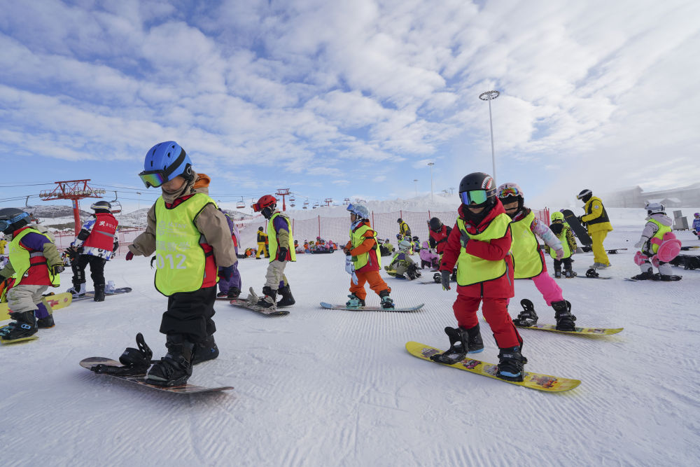 12月1日,学生在阿勒泰将军山国际滑雪度假区练习单板滑雪。新华社记者 阿曼 摄