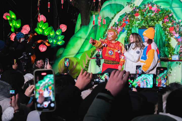 12月17日,外国媒体记者在长春市动植物公园与西游记主题表演演职人员进行互动。