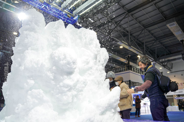 12月18日,外国媒体记者在第九届吉林冰雪产业国际博览会现场参观中国制造的造雪机。