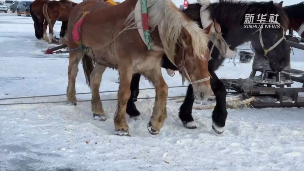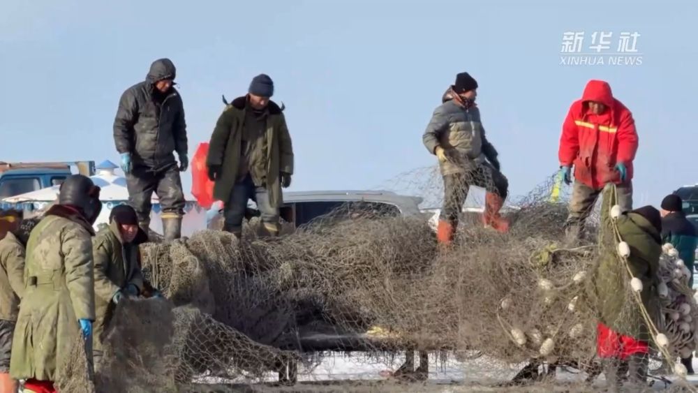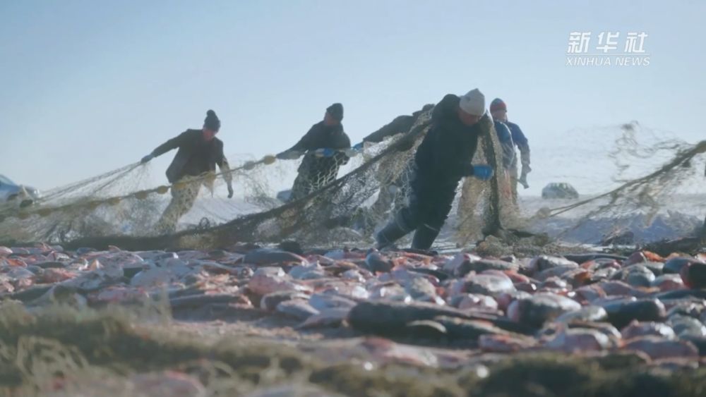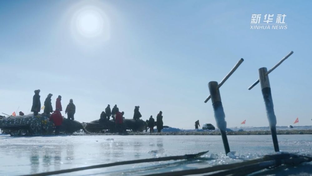 凿冰、穿杆,千米大网在冰湖内缓缓舒展。马拉绞盘转动,大网被缓缓从湖中拖出,冰湖腾鱼的盛景再次重现。