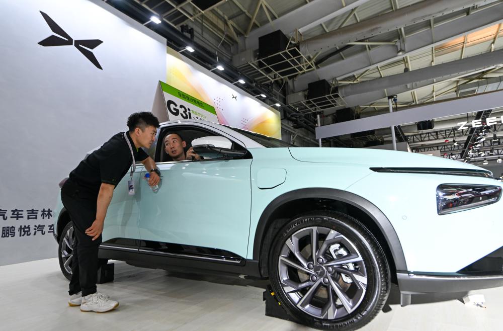 7月17日,一名参观者在长春汽博会小鹏汽车品牌展区体验一款汽车。
