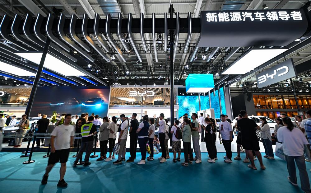 7月17日,观众在长春汽博会比亚迪品牌汽车展区前排队等待入场。