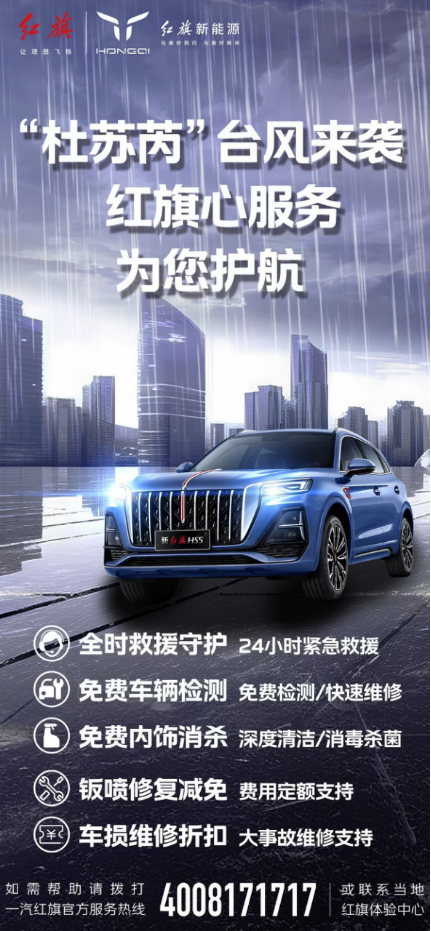 台风来临前,及时发布预警信息,提醒台风天用车安全事项,通过微信、短信等途径覆盖用户8.5万人次,有效保障用户出行安全。同时,红旗品牌快速出台专项关怀政策,为受灾用户车辆提供“全时救援守护、免费车辆检测、免费内饰消杀、钣喷修复减免、车损维修折扣”5项权益,切实让用户感受到红旗品牌的关怀与温暖。截止8月3日,一汽红旗已累计收到车辆救援需求257台,拖车回店220台,现场维修37台。