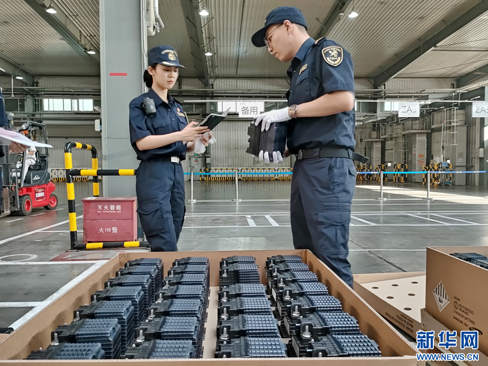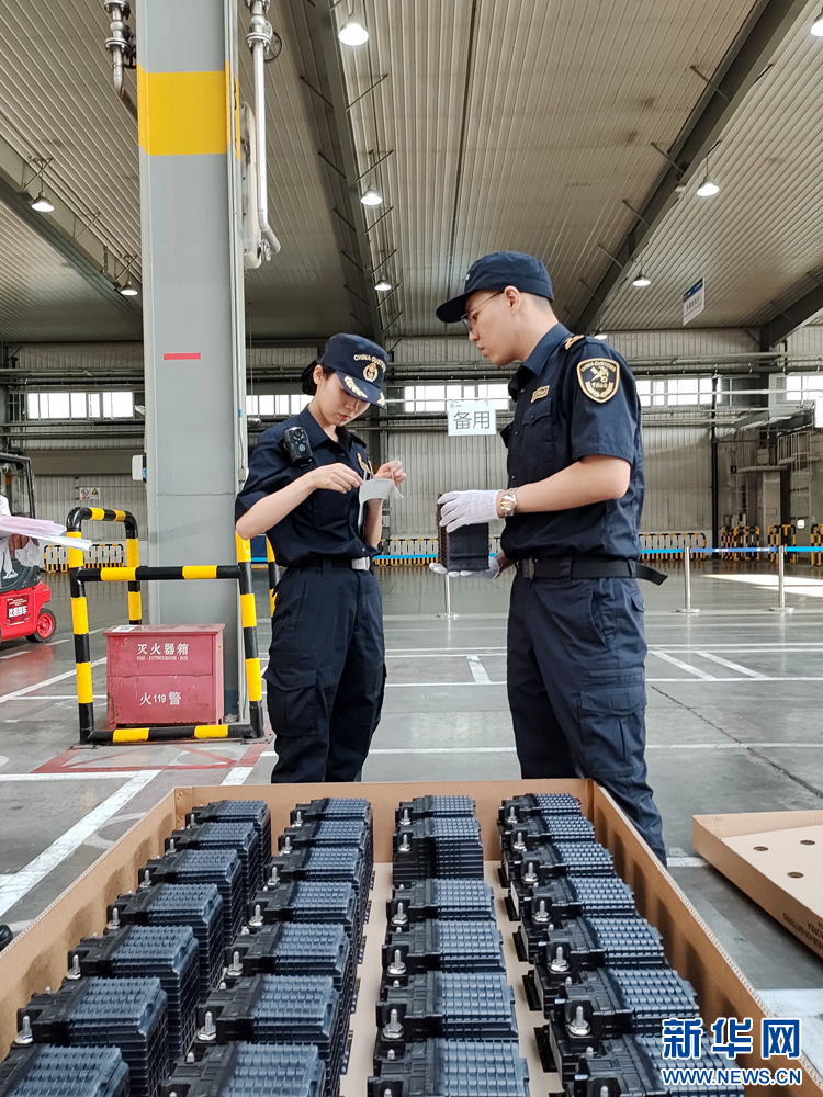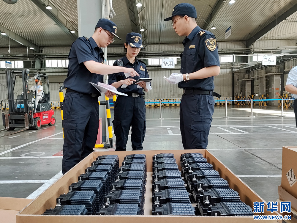 长春兴隆海关监管三科科长王荟淞(左一)和同事对车用电池进行开箱检查。 黄维摄/新华网发