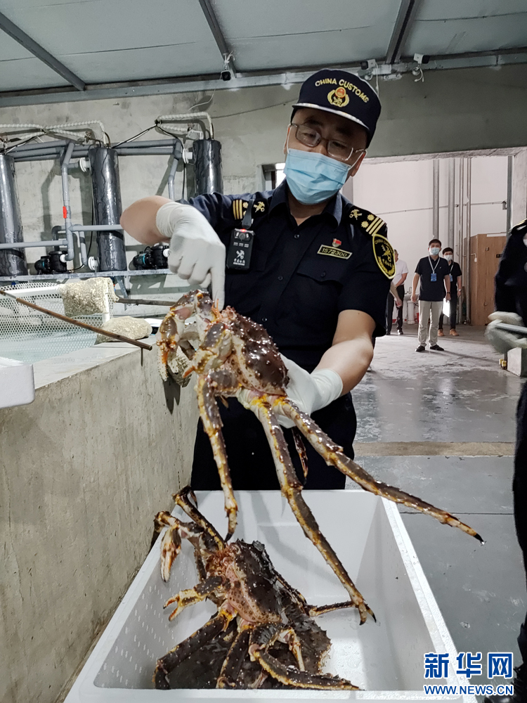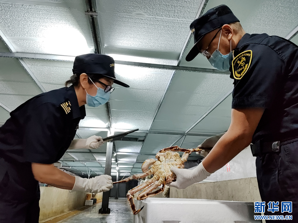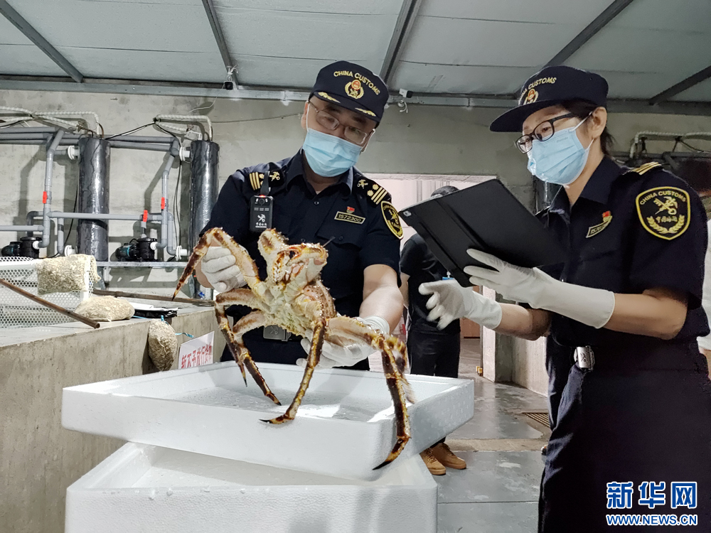关员牛玉波、姜涛在查验进境帝王蟹。 黄维摄/新华网发
