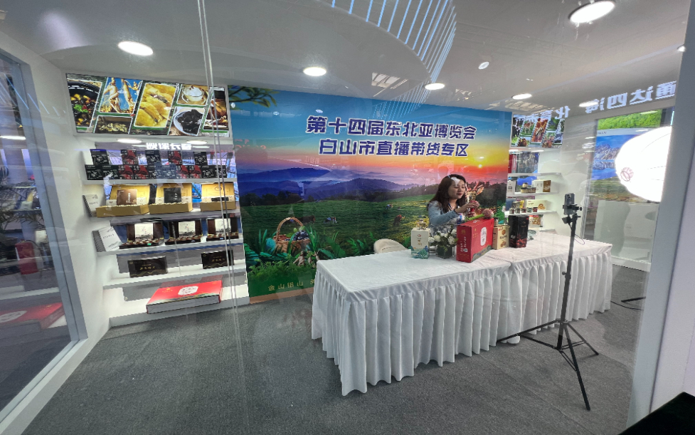 据白山市商务局安全生产监督管理科科长邓吉昌介绍,展会直播间造型设计融入“白派建筑”,将沈白高铁白山东站造型作为设计元素融入其中,塑造反映长白山地域特色文化的新建筑形态。同时,在展会期间,白山馆实现线上线下相结合、相融汇、相协调的方式,通过直播间不间断推介,突出特色,集聚人气,吸引更多客商关注白山、了解白山、投资白山。
