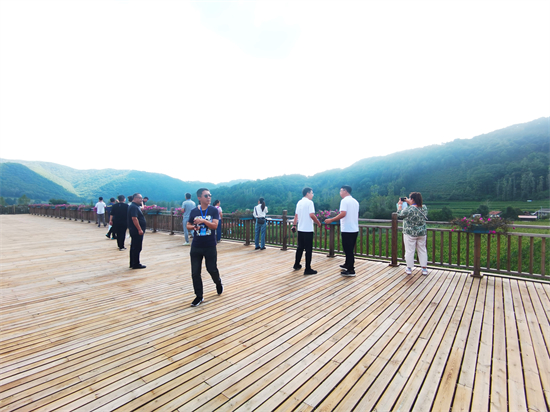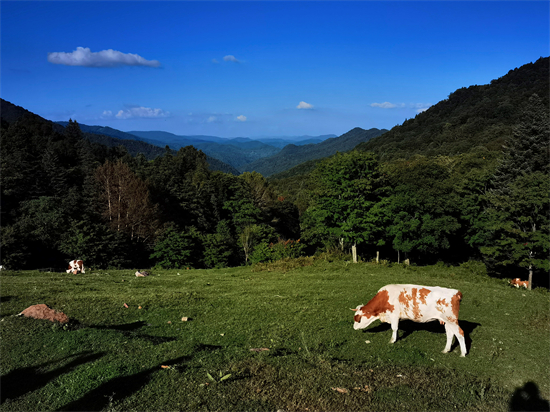 下午,采访团穿越崇山峻岭、攀山而上,来到位于临江市花山镇老三队村的溪谷高山草原,探寻原生态森林旅游风景区秘境。这里是以低矮的蒿科植物为主的高山草场,一眼望去广阔无垠,成群的牛羊在其间悠闲漫步,在四周五彩缤纷的山林包围之中,好似一片隐世乐土,是旅游的绝佳“打卡地”,也是临江市紧紧围绕白山市委“一山两江”战略品牌建设,积极构建全域旅游格局取得的新成效。