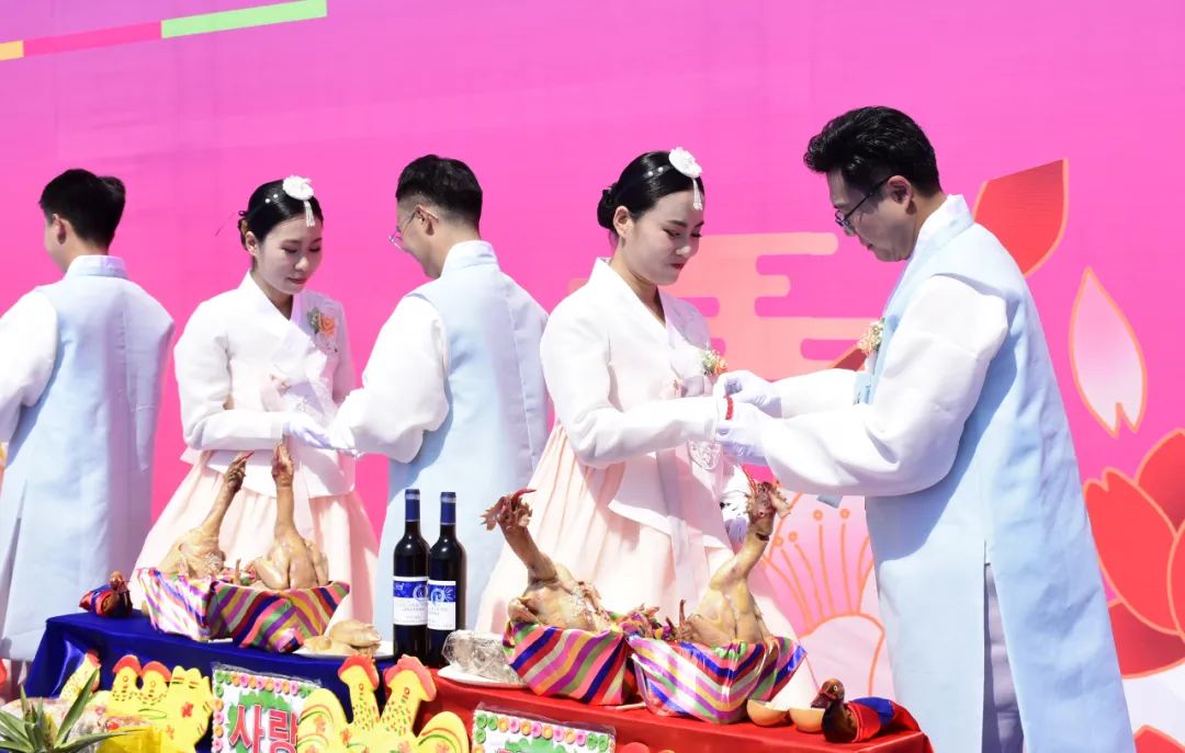 身着不同少数民族服饰的小模特们跟随着动感十足的韵律自信走秀,让在场宾客沉浸在中华优秀传统文化的独特风韵和中华民族一家亲的浓厚氛围中。奠雁礼、合卺礼、交拜礼、鸡蛋礼、备茶啖桌、拜父母……16对新人身着朝鲜族民族服饰,满怀着对新生活的美好憧憬,庄重地完成一系列朝鲜族婚俗礼仪。
