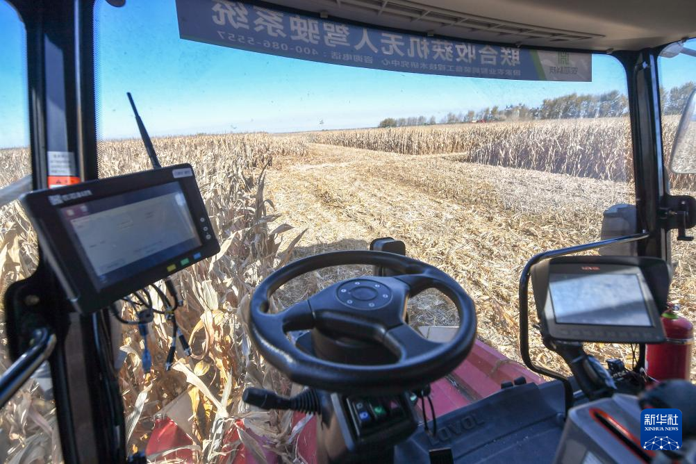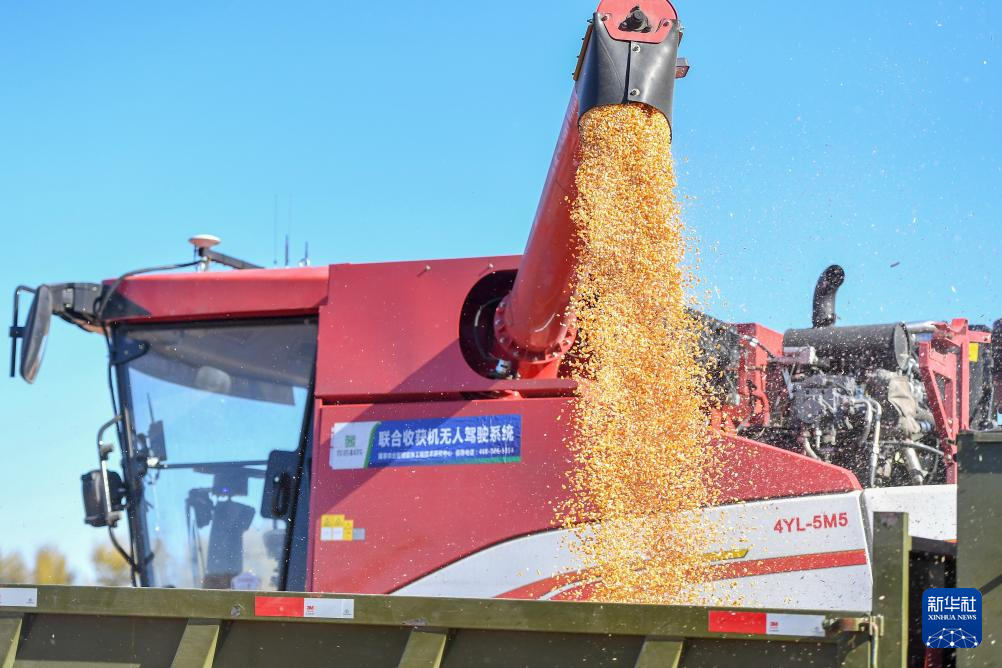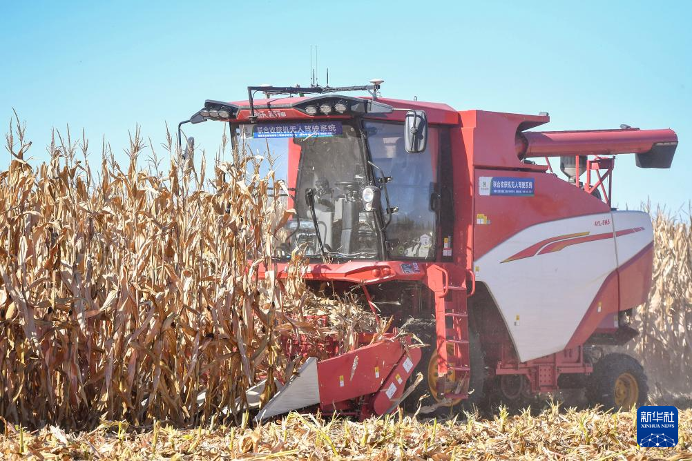 10月19日,在中国科学院“黑土粮仓”科技会战长春示范区公主岭示范基地,无人驾驶农机在收获玉米。新华社记者 张楠 摄pagebreak