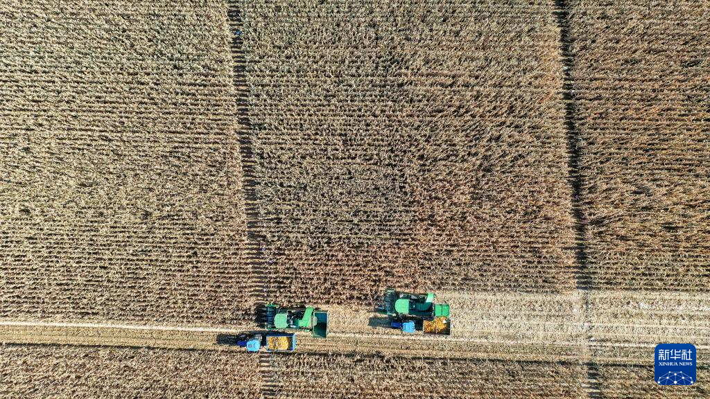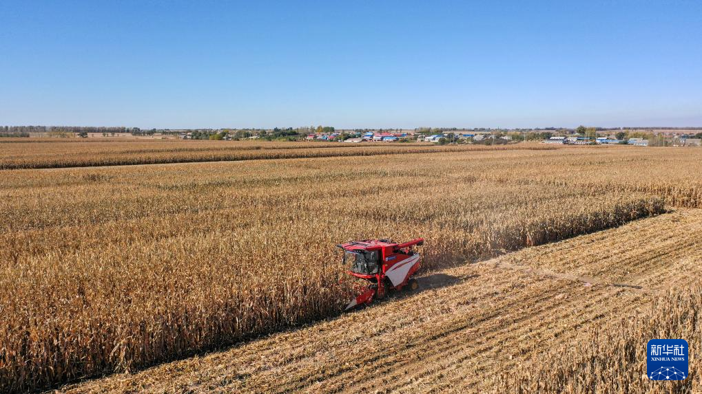10月19日,在中国科学院“黑土粮仓”科技会战长春示范区公主岭示范基地,工作人员驾驶农机收获玉米(无人机照片)。 新华社记者 张楠 摄pagebreak