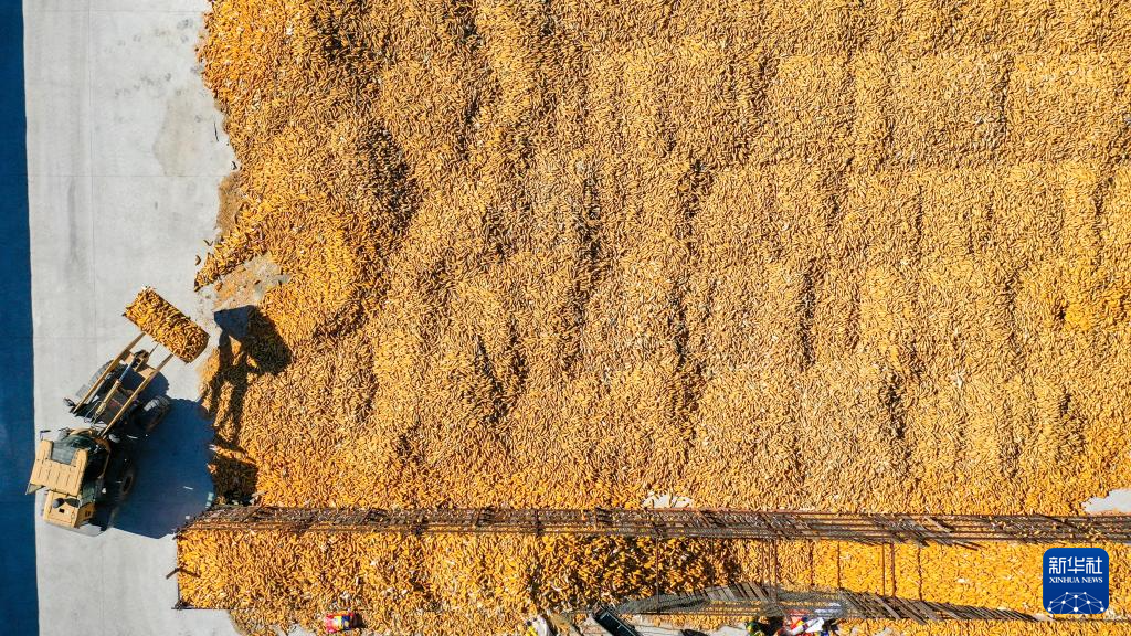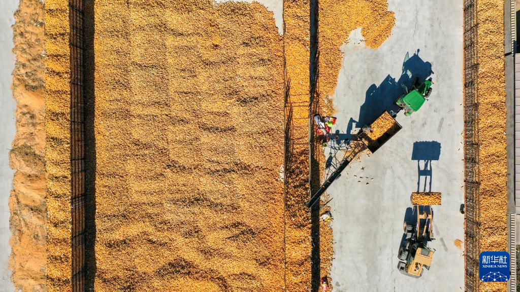 10月19日,在吉林省公主岭市友忠种植农民专业合作社,农民将收获的玉米放入科学储粮仓(无人机照片)。新华社记者 张楠 摄pagebreak