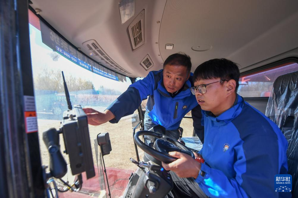 10月19日,在中国科学院“黑土粮仓”科技会战长春示范区公主岭示范基地,中国科学院东北地理与农业生态研究所高级工程师陈国双(左)与团队成员调试无人驾驶农机。 新华社记者 张楠 摄pagebreak