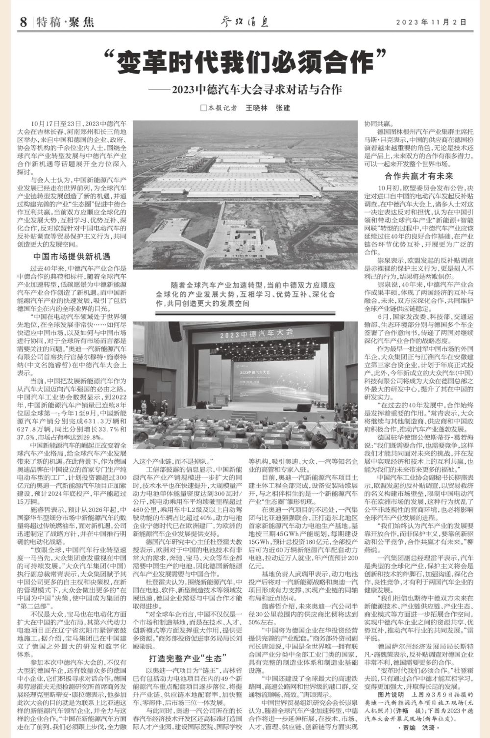 10月17日至23日,2023中德汽车大会在吉林长春、河南郑州和长三角地区举办,来自中国和德国的企业、政府、协会等机构的千余位业内人士,围绕全球汽车产业转型发展与中德汽车产业合作新机遇等话题展开全方位深入探讨。