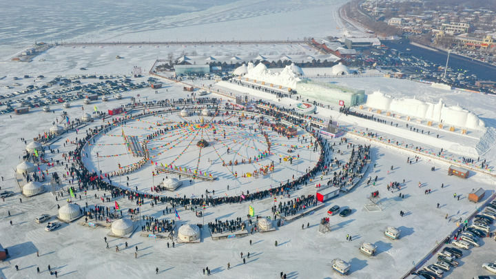 2022年12月28日,在查干湖第二十一届冬捕节现场,游客观看祭湖醒网仪式(无人机照片)。新华社记者 张楠 摄