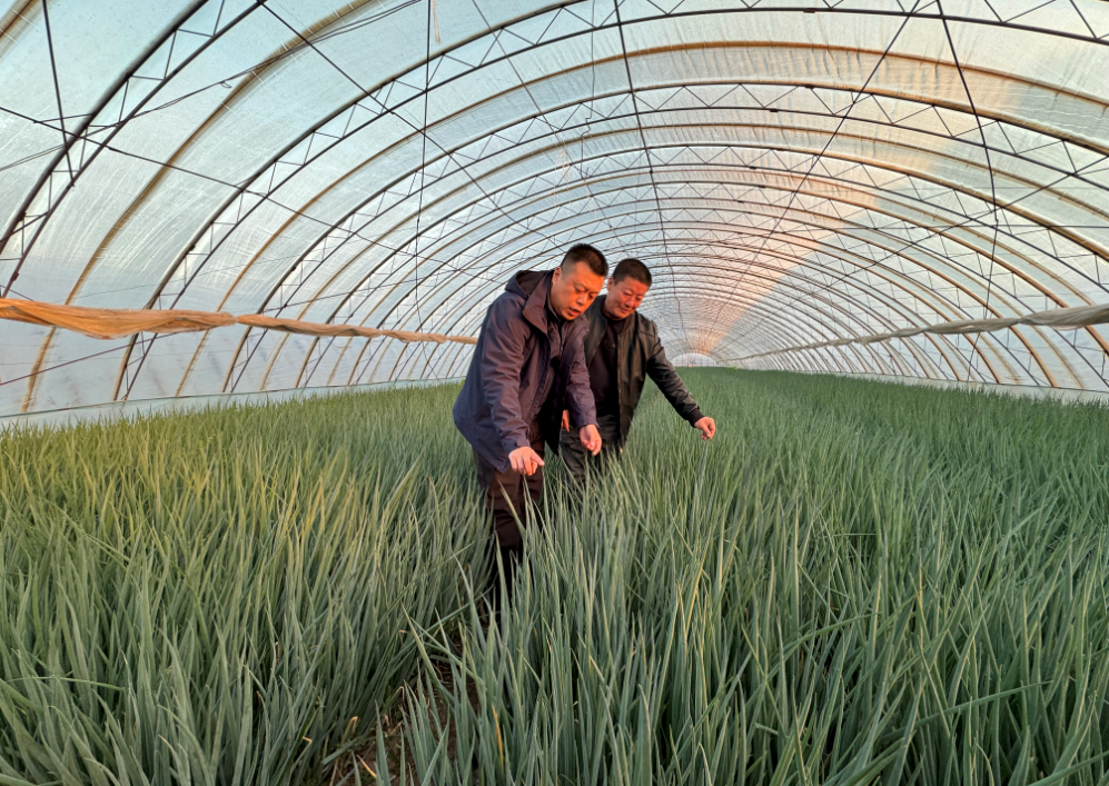 11月3日,张弢和三里堡子村蔬菜种植专业合作社成员邢连宝在大棚内查看香葱生长情况。新华社记者金津秀 摄