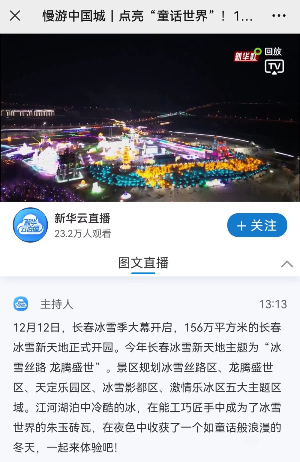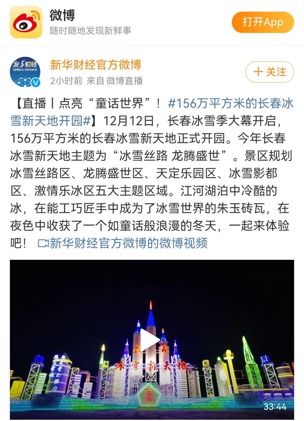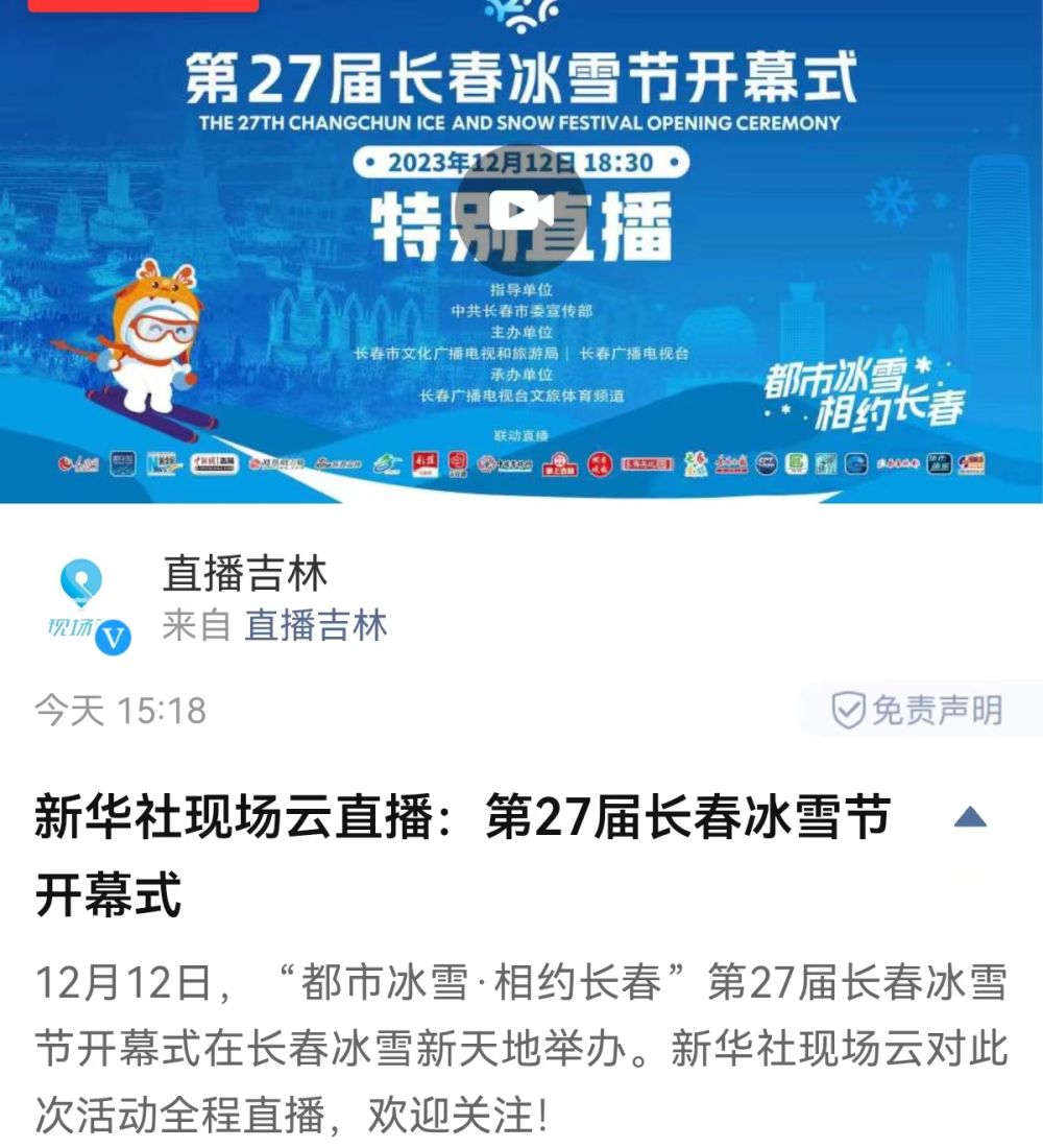 12月12日,长春冰雪季大幕开启。156万平方米的长春冰雪新天地正式开园。新华社财经微博、百度直播、秀我中国、现场云、新华云等多个平台对活动进行现场直播。