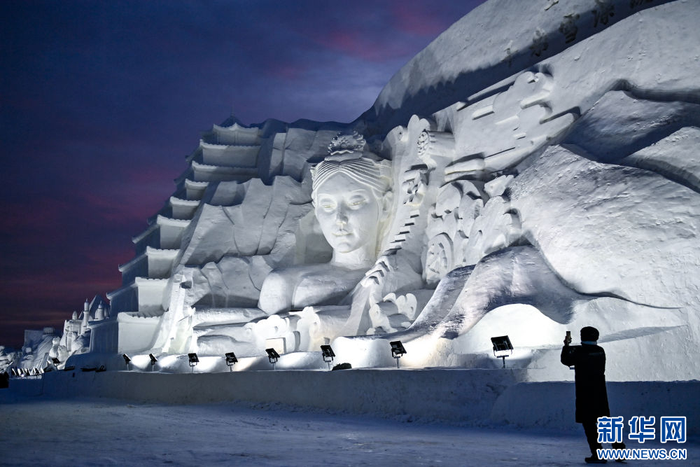 12月12日,游客在长春冰雪新天地的一处雪雕拍照。(新华社记者 颜麟蕴 摄)