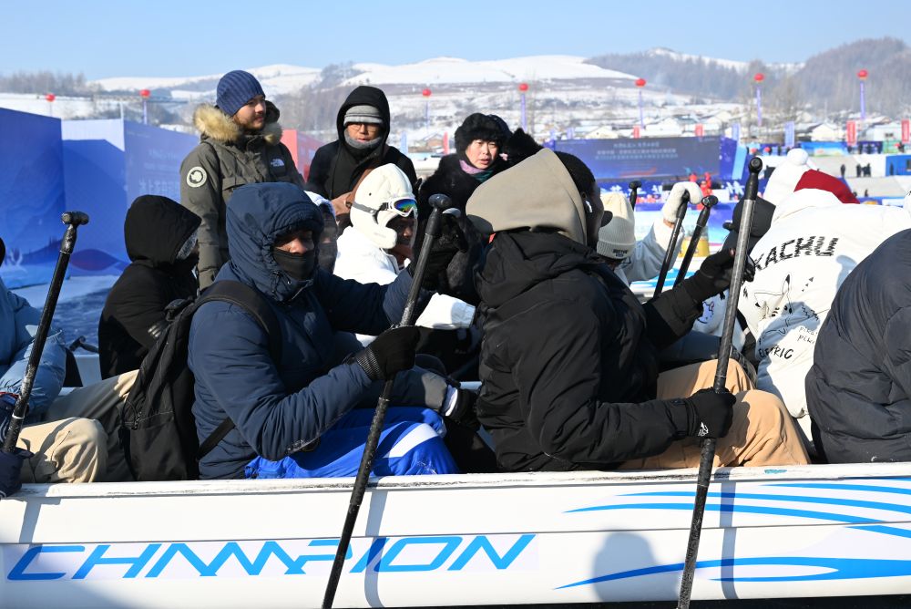 记者在现场看到,30余名外国参赛选手早早来到比赛场地,刚下车的他们,似乎对眼前的一切既感到兴奋又充满期待。“尽管我来中国六年多了,但这是我第一次参加冰雪运动,我特别兴奋,我今天特意穿了两层袜子,但还是很冷。”来自尼日利亚的留学生王佳乐说。这些参赛队员大多是来自赤道附近热带国家的留学生,绝大多数更是第一次接触冰上龙舟,对于冰雪运动的了解屈指可数,他们对冰天雪地充满着无限的期待和好奇。