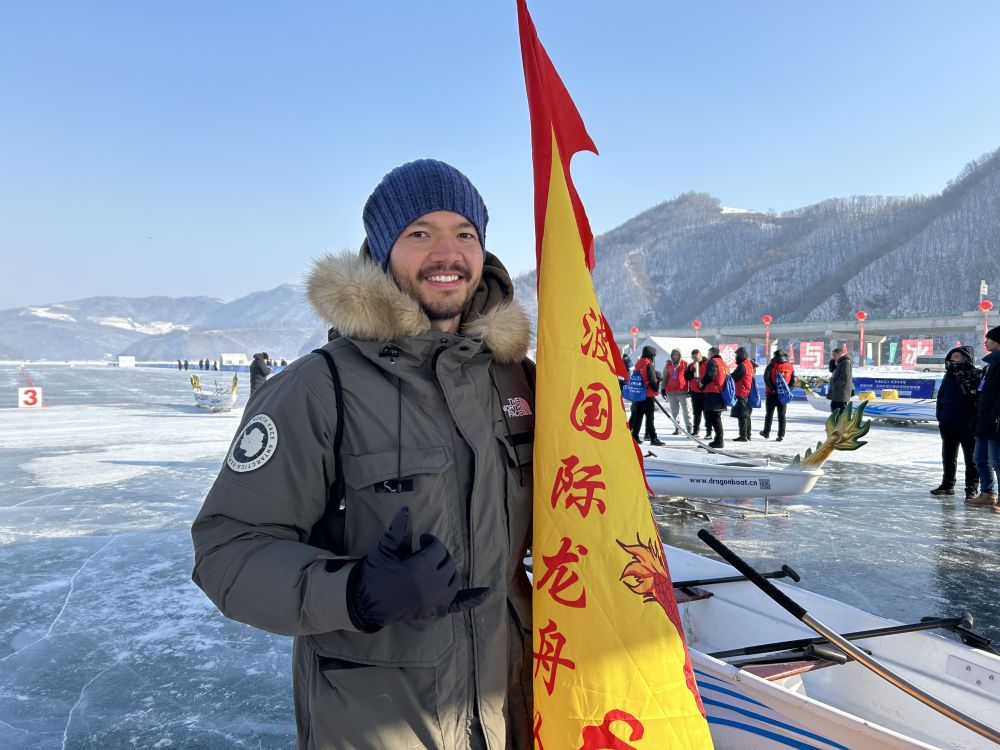 来自巴拿马的张亚松目前是宁波大学运动训练专业的一名学生,他也是此次为数不多参加过冰上龙舟比赛的选手。只见他时而担当鼓手角色,时而为队友们耐心讲解如何使用冰钎……“我2019年就参加过冰上龙舟比赛了,平时接触水上龙舟多一些,但这完全是两种不同的体验。冰上龙舟滑行更难,而且对肌肉力量的要求更高。”张亚松说。