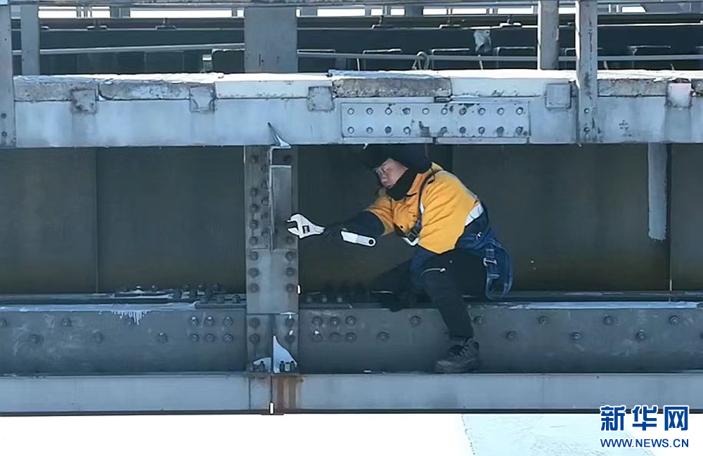 桥顶桁梁上冰霜覆盖的花纹钢板,踩上去像冰面一样光滑。任宝恒将安全绳系好并将另一头固定在护栏上,做好防护后,他快速地前行检查桁梁上螺栓、漆面、钢梁等设备的状态,发现螺母松动就立即修复,发现漆面脱落当场记录位置……