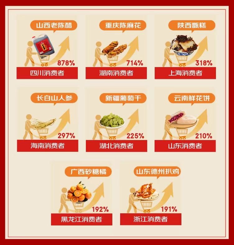 来自京东的统计数据,揭示了一些有趣的年货走向:黑龙江消费者买走了更多广西砂糖橘,成交额同比增幅达192%;四川消费者今年最喜爱的年货之一是山西老陈醋,成交额同比增幅达878%;喜欢吃醋的山西消费者,则买走了很多广式香肠,成交额同比增幅达537%;山东消费者喜欢购买云南鲜花饼;上海消费者今年喜爱的年货是陕西甑糕……