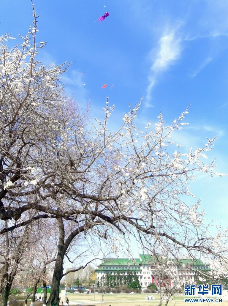 长春市文化广场桃花盛开,赏花、放风筝正当时