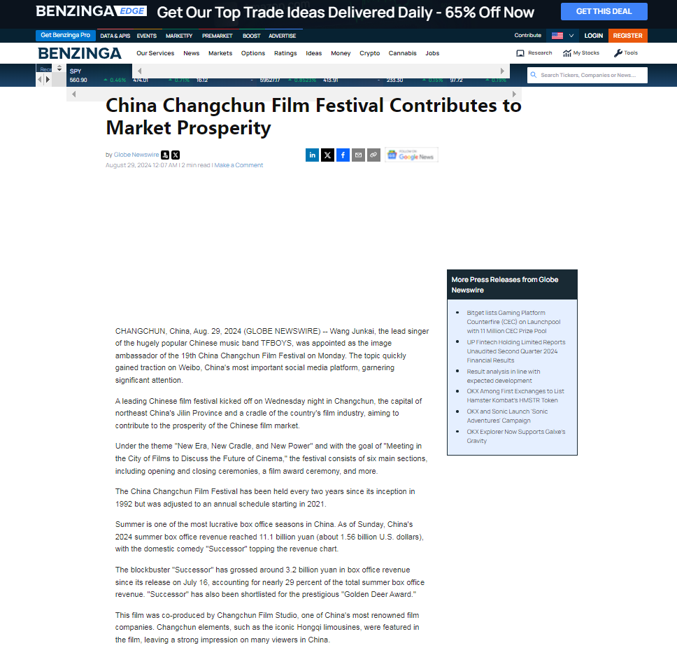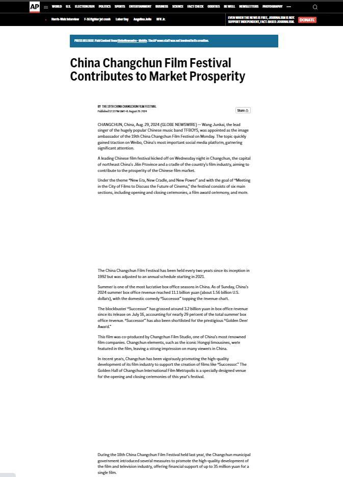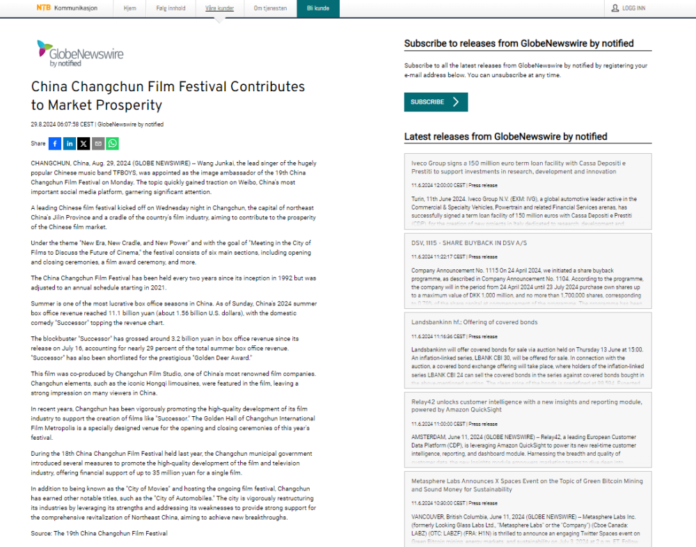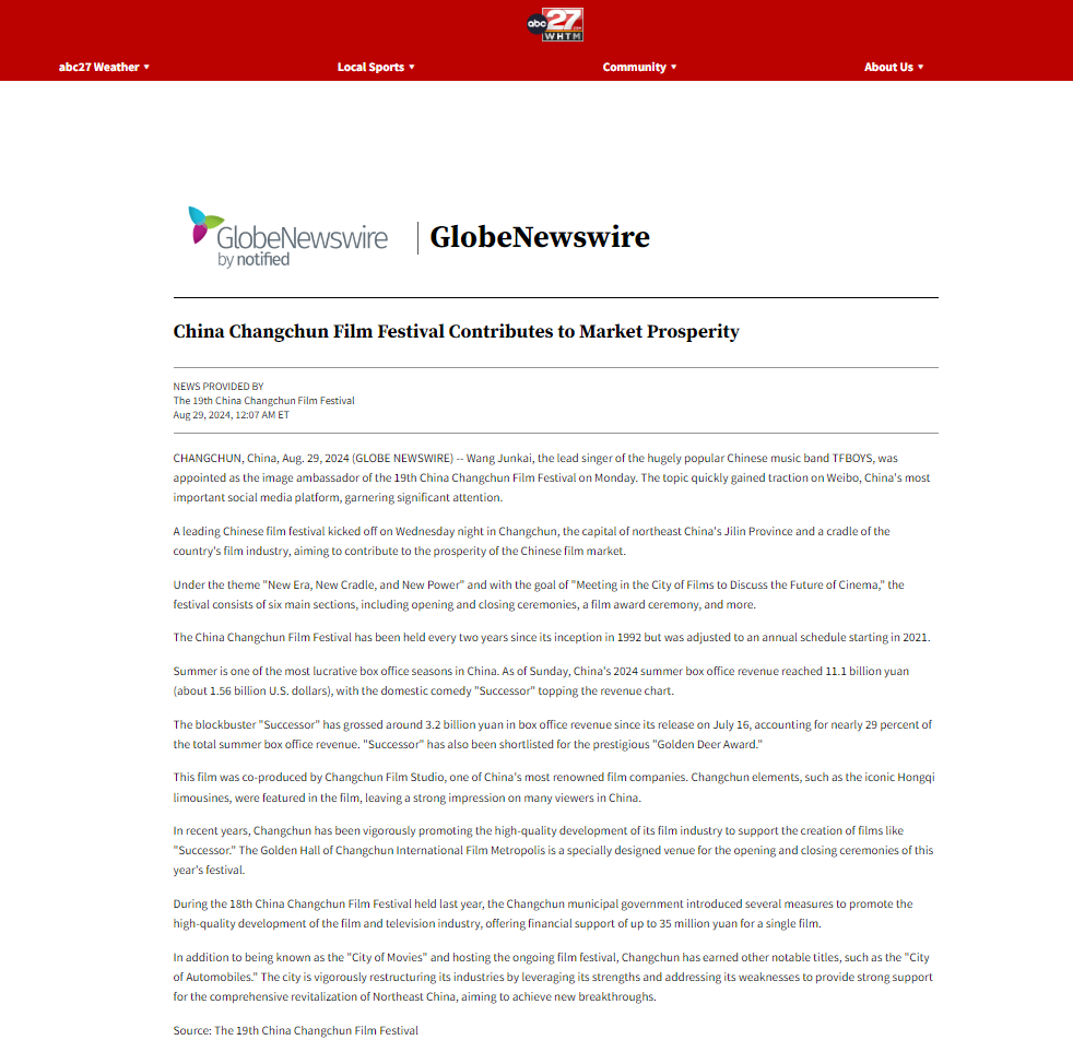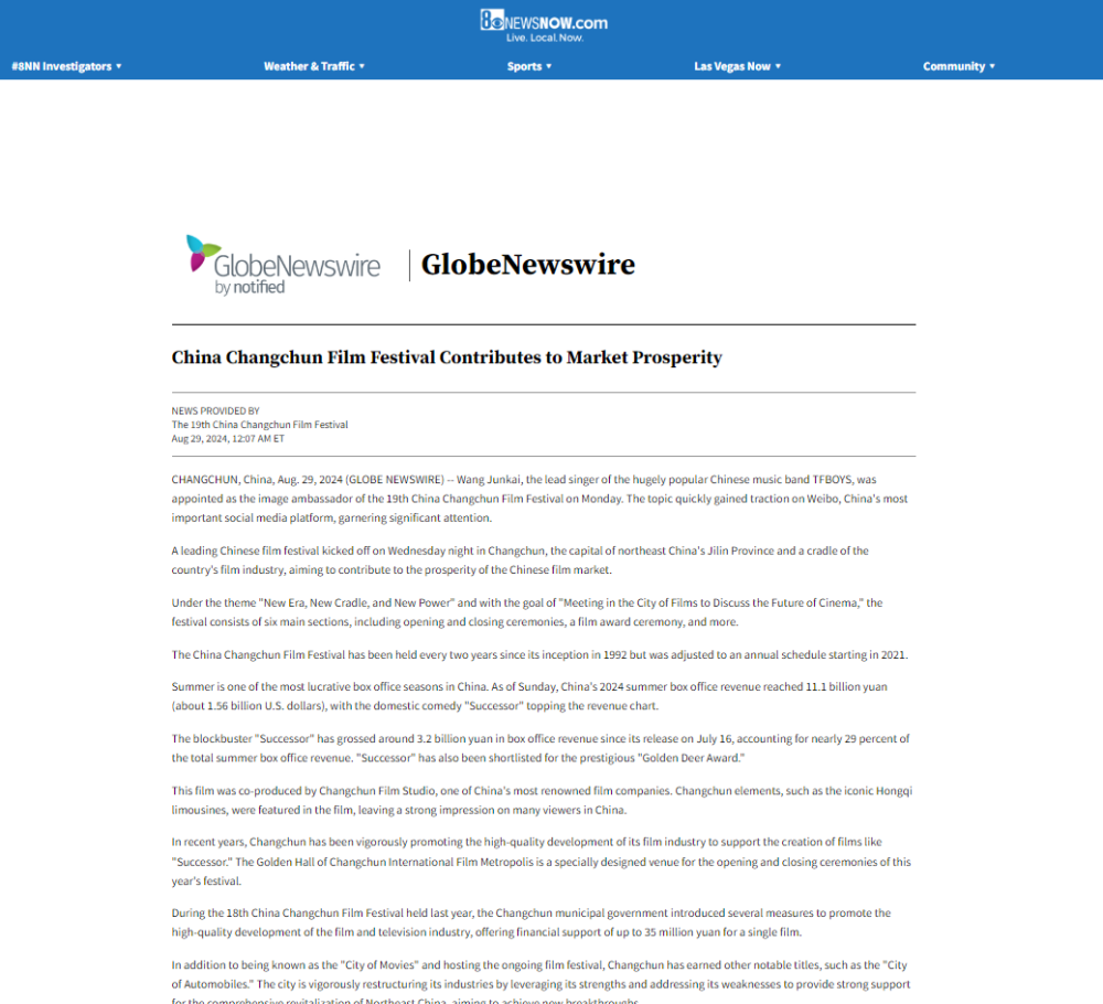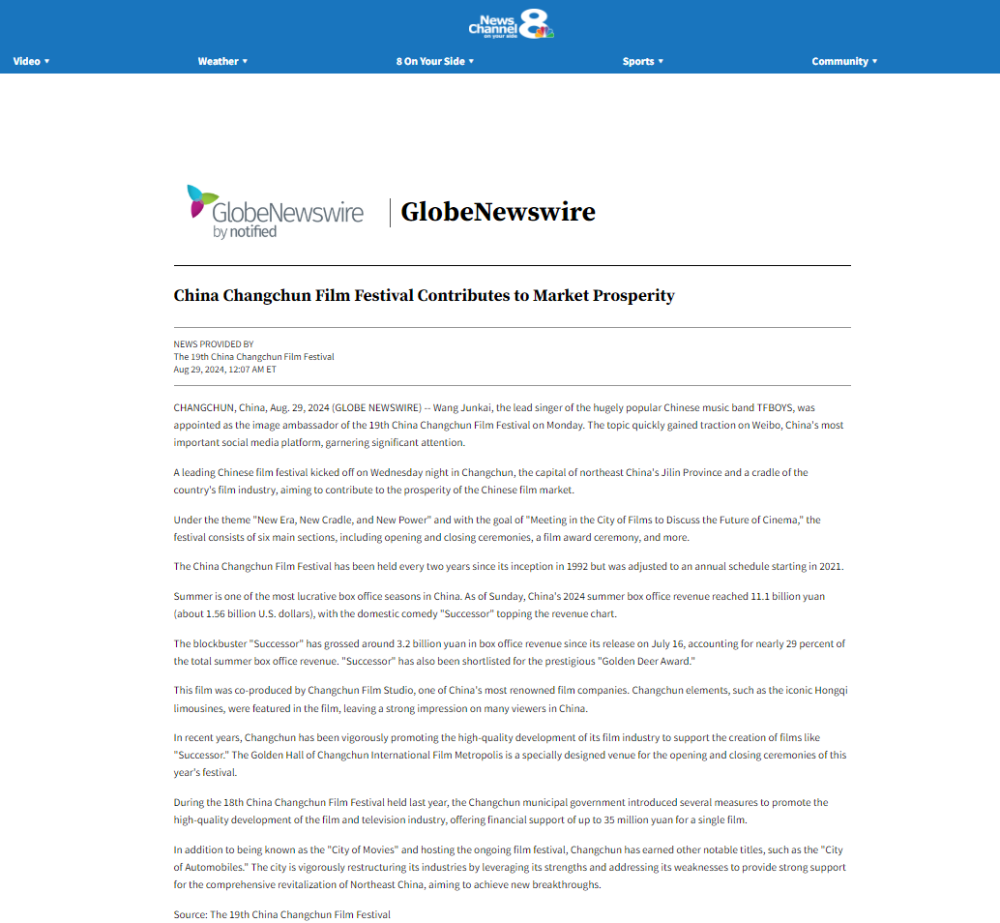8月29日,新华社采写的《中国长春电影节助力中国电影市场繁荣》外文推广稿件《China Changchun Film Festival Contributes to Market Prosperity》在美国、德国、英国、法国、挪威、芬兰等欧美地区11个国家以三种语言同时发布,并第一时间被当地主流媒体、门户网站及重点资讯网站广泛转载落地,总量达1239家次,浏览量超2.5亿人次。