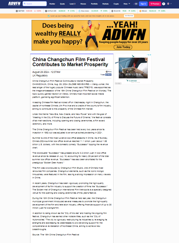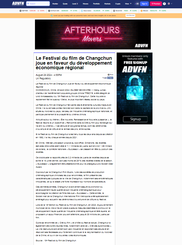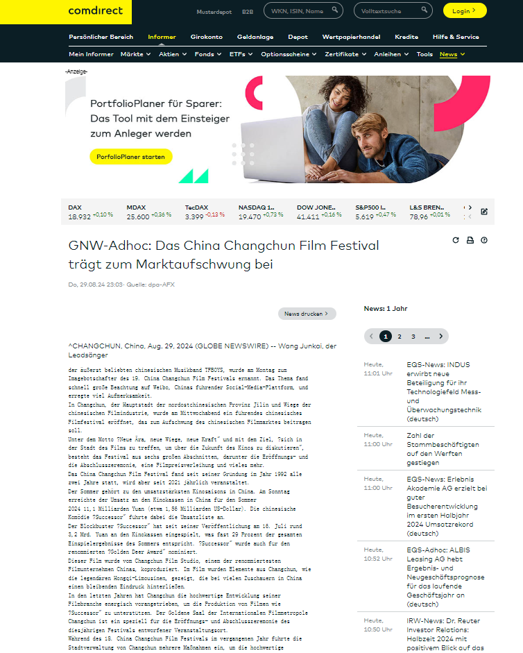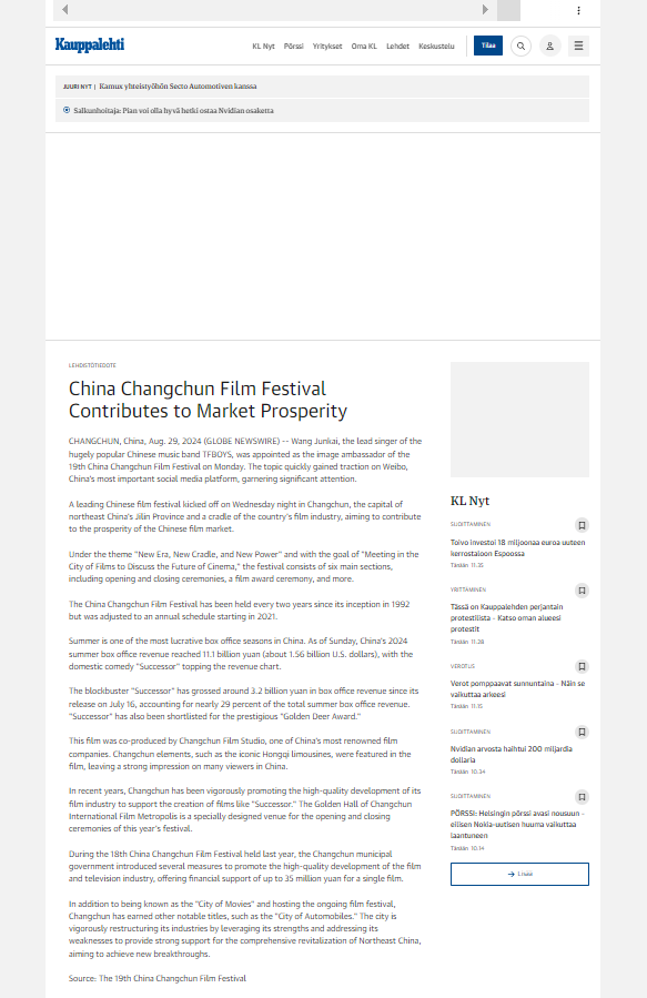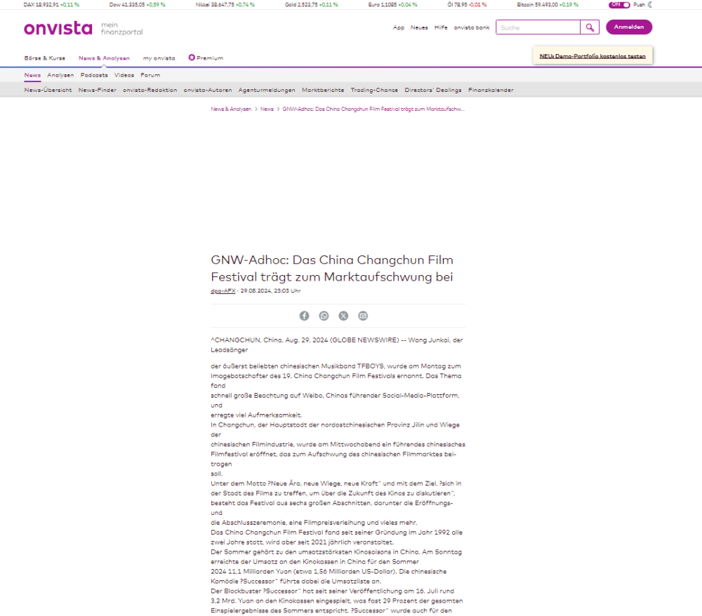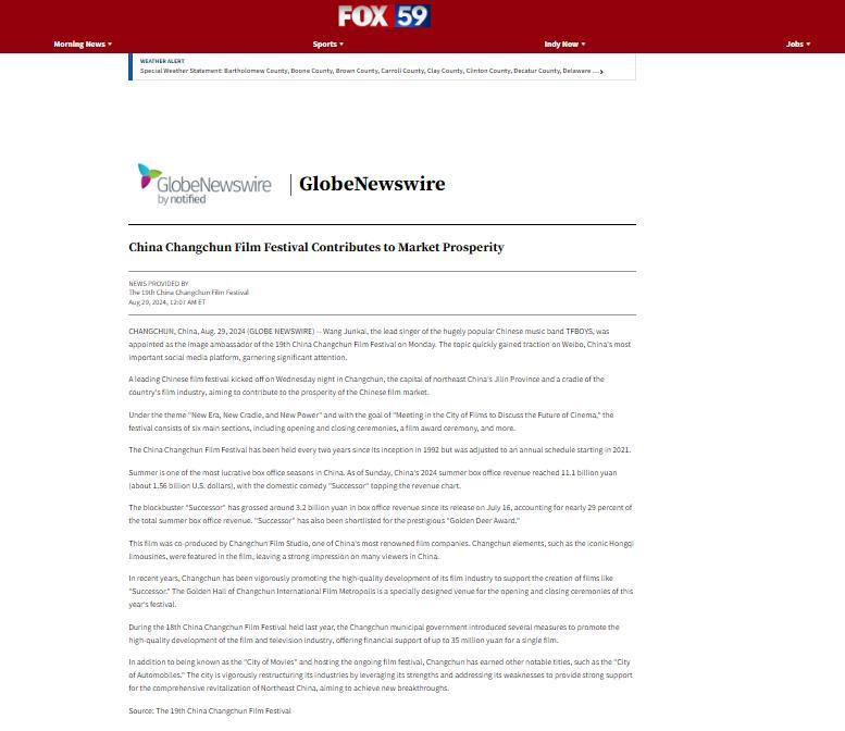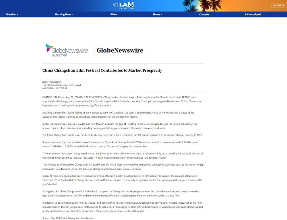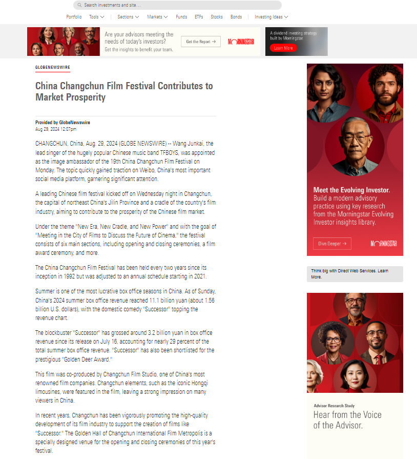 8月29日,新华社采写的《中国长春电影节助力中国电影市场繁荣》外文推广稿件《China Changchun Film Festival Contributes to Market Prosperity》在美国、德国、英国、法国、挪威、芬兰等欧美地区11个国家以三种语言同时发布,并第一时间被当地主流媒体、门户网站及重点资讯网站广泛转载落地,总量达1239家次,浏览量超2.5亿人次。