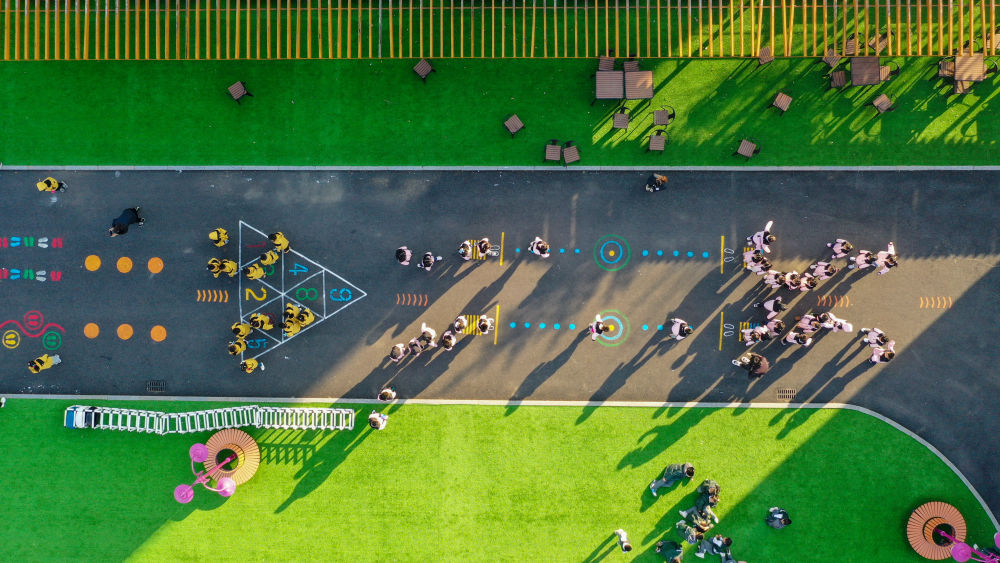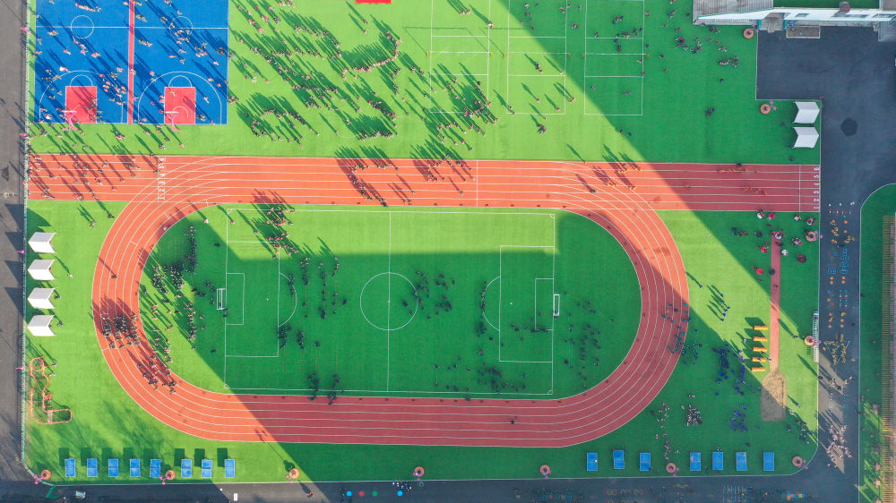 11月11日,在长春市第一实验银河小学,学生在操场上进行课间活动(无人机照片)。