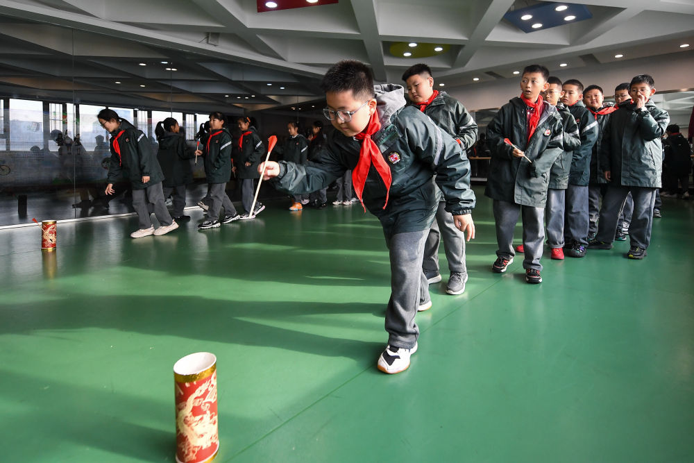 11月11日,在长春市第一实验银河小学,教师为学生示范课间活动游戏玩法。