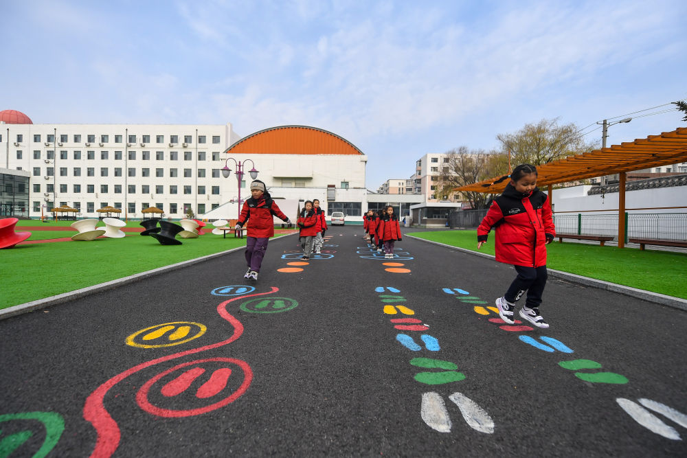 11月11日,在长春市第一实验银河小学,学生在操场上进行课间活动。