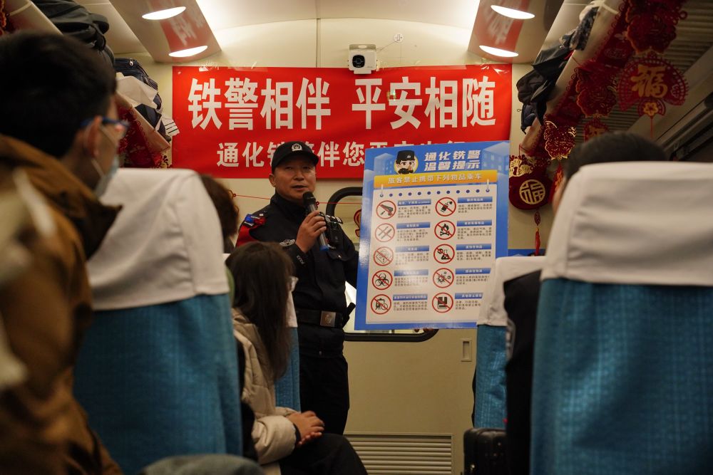 通化站始发,终到北京站的K430次列车,途经13个车站,全程运行近17小时。春运期间,乘警的巡查频次增加,每节车厢每小时要巡查两次,就连夜间也不例外。