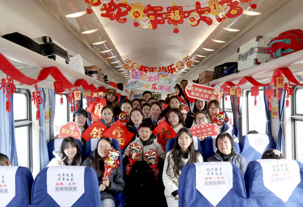 1月14日,列车工作人员在联欢活动后与旅客合影留念。 新华社发(王旺旺摄)
