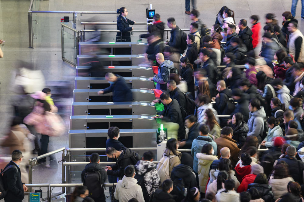 2025年1月14日,在成都东站,乘客依次通过检票口乘车。新华社记者 王曦 摄