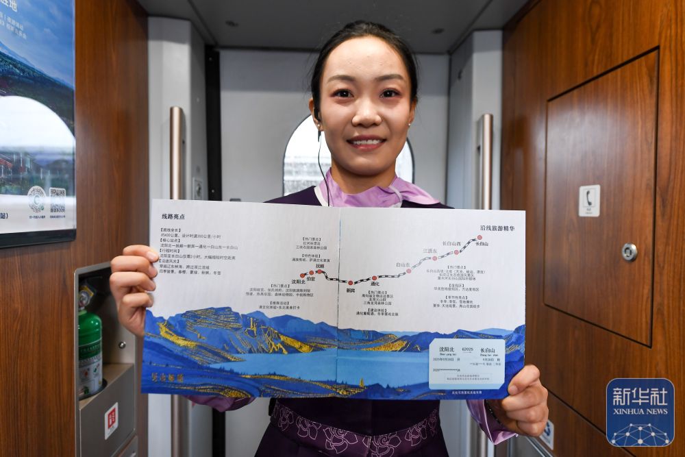 ↑ 9月28日,乘务员在G8166次列车上展示首发纪念册。新华社记者 张楠 摄