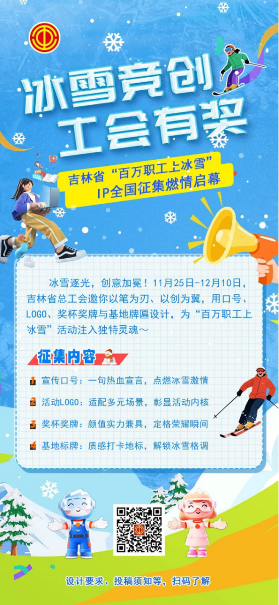 ★吉林省总工会将于2025年12月末至2026年2月末开展吉林省“百万职工上冰雪”活动,11月25日至12月10日面向全国公开征集活动宣传口号、LOGO、奖杯奖牌设计方案、“吉工冰雪训练体验基地”标牌设计方案。详情>>>