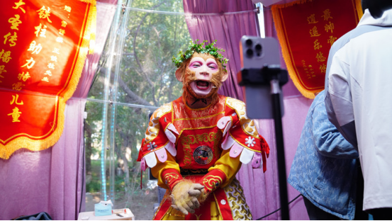 夜幕下的长春动植物公园,年轻情侣举着文创雪糕与“孙悟空”NPC自拍合影,孩子们围绕着舞台表演欢呼雀跃……