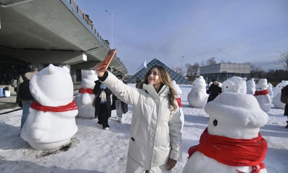 采风团成员在长白山站前与雪人合影
