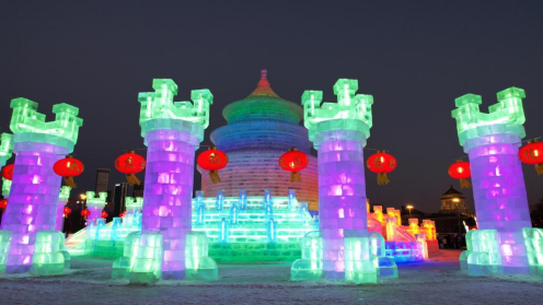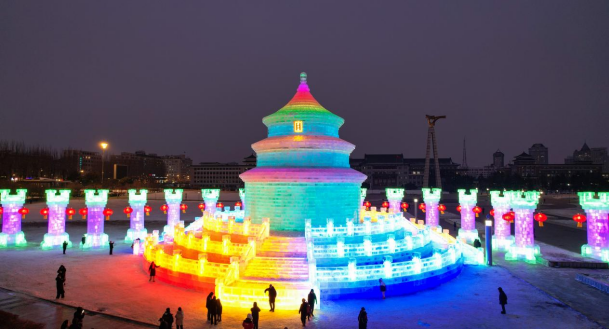 该冰雕位于文化广场,以天坛建筑为核心,配以祈年殿标识,融合长城元素与红灯笼,总高21米的大型冰雕。以“盛世中华”为主题,通过复刻天坛这一中华传统文化地标,传递对国家繁荣昌盛的美好祝愿。
