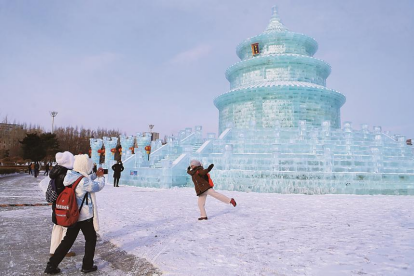 ★小朋友王子瑄兴奋地指着文化广场上“盛世中华”巨型冰雕说:“哇塞,妈妈快看,真漂亮啊!”