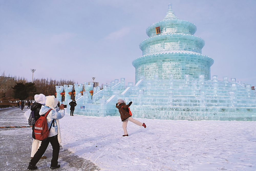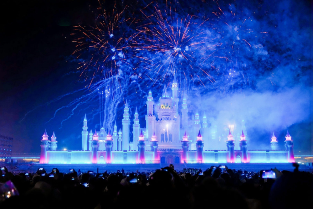18米高的巨型蛋仔雪雕搭配270个雪雕矩阵,成为赛事间隙的热门打卡点。88米长的冰雪城堡白天与冰雪相映成趣,在夜幕下,三维映射技术与烟花交织出的光影秀,更令市民和游客驻足欣赏,“这简直就是家门口的迪士尼!”南京游客小徐说。