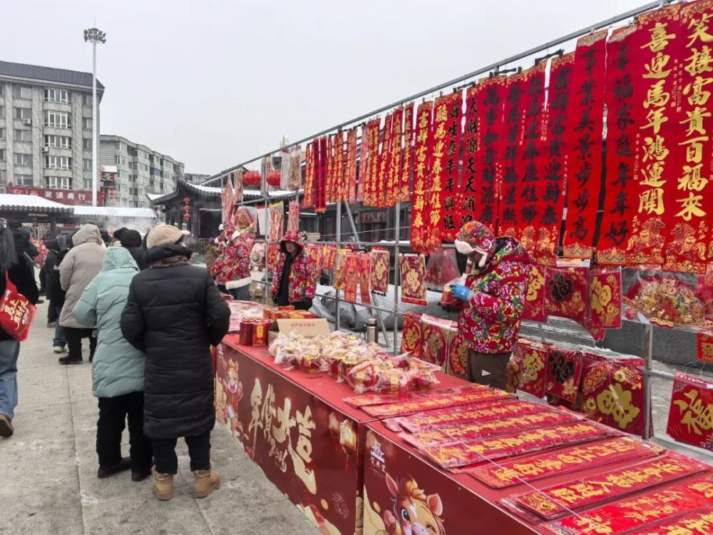 大集内,66个摊位整齐排列,涵盖春联、装饰、冻货、干调、糖果、地方特产等数百个品类,实现“一站式”购齐。