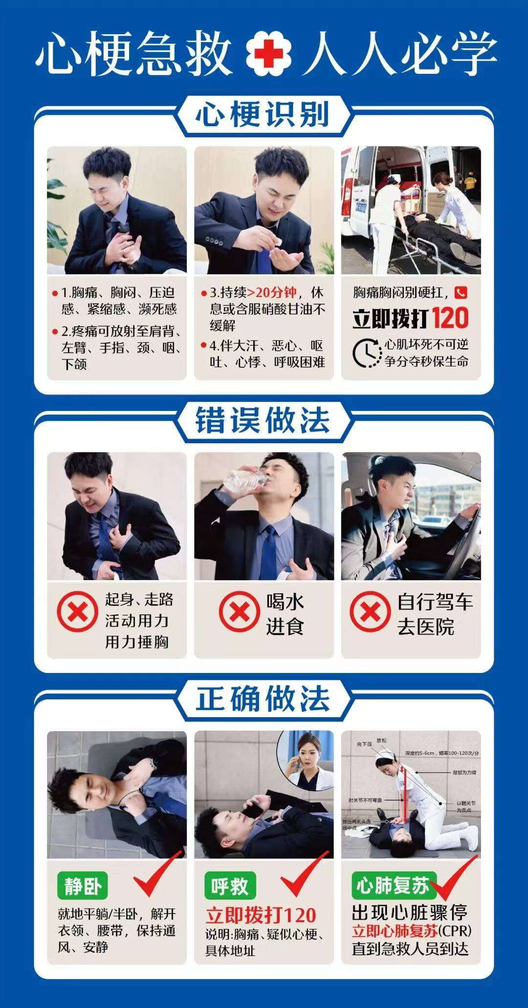心梗急救,人人必学。不移动、不进食、不硬扛、立刻静卧,拨打120。 心脏骤停,立即心肺复苏。